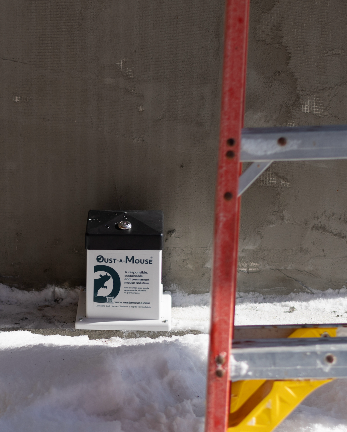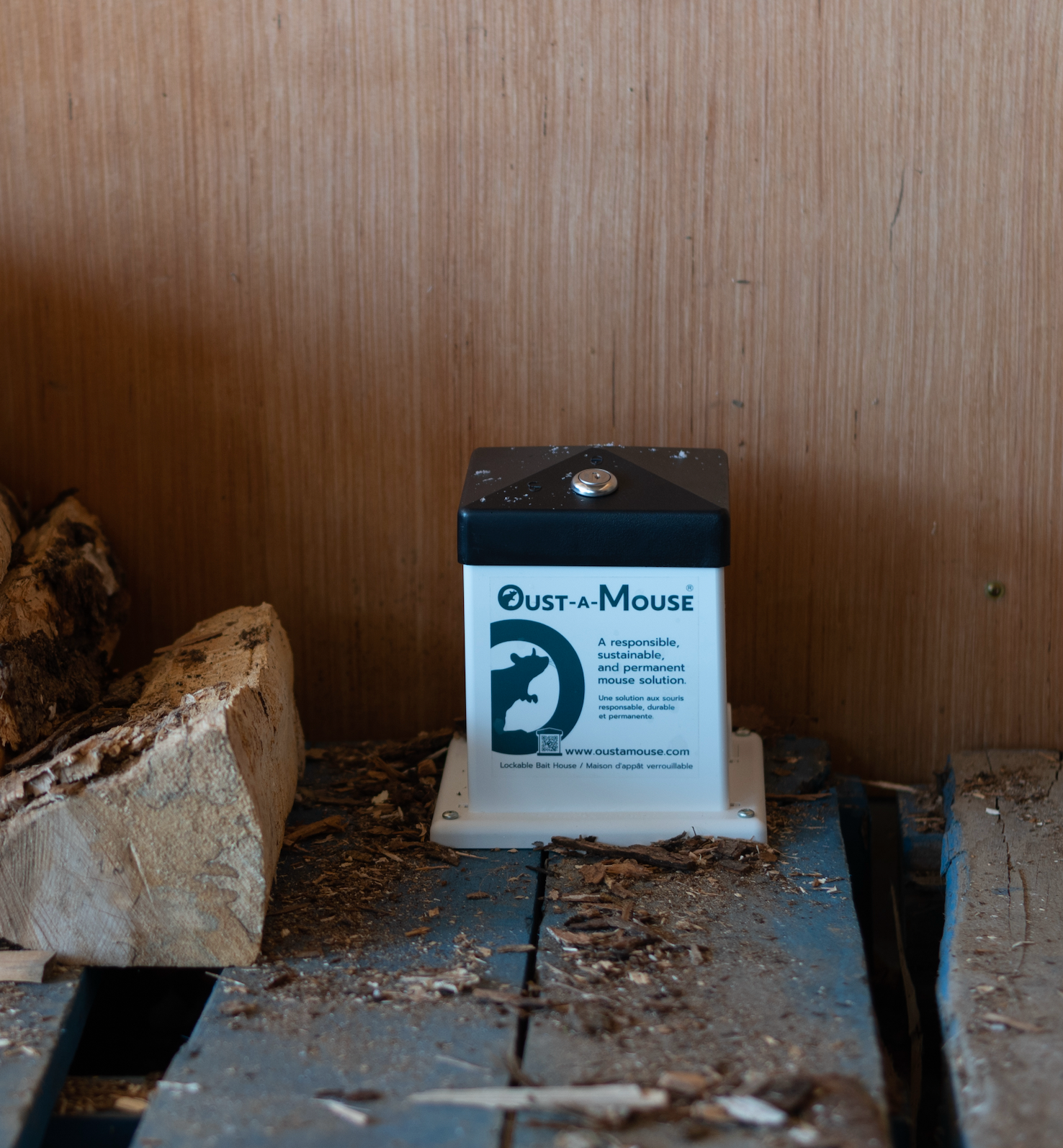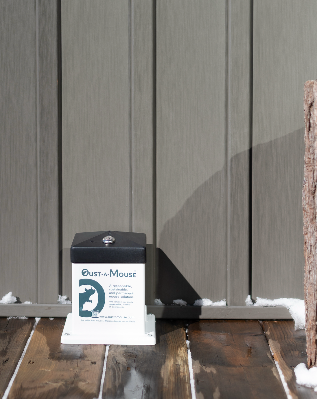 “Oust-A-Mouse” n’est pas un piège à souris, il s'agit plutôt d'une station d'appât durable, réutilisable et résistante aux intempéries. Elle est conçue pour être à l'extérieur, sécurisant le poison qui attire les souris de l'intérieur et dissuade tout autre souris d’entrer dans les bâtiments. Son couvercle verrouillable et ses trous d'accès fortifiés empêchent les enfants, les animaux domestiques et les autres animaux sauvages d'accéder à l'appât.